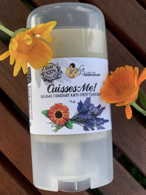 Concocté à partir de beurres de karité et de mangue nourrissants et apaisants ainsi que de macérât de calendula anti-inflammatoire et réparateur, Cuisses-Me ! protège des frictions répétées qui irritent la peau. De l’argile blanche adoucissante ainsi que de l’allantoïne réparatrice ajoutent encore plus de douceur et de bienfaits protecteurs à cet heureux et savant mélange. Il convient parfaitement aux peaux sensibles. Il est consigné dans un contenant applicateur pratique.