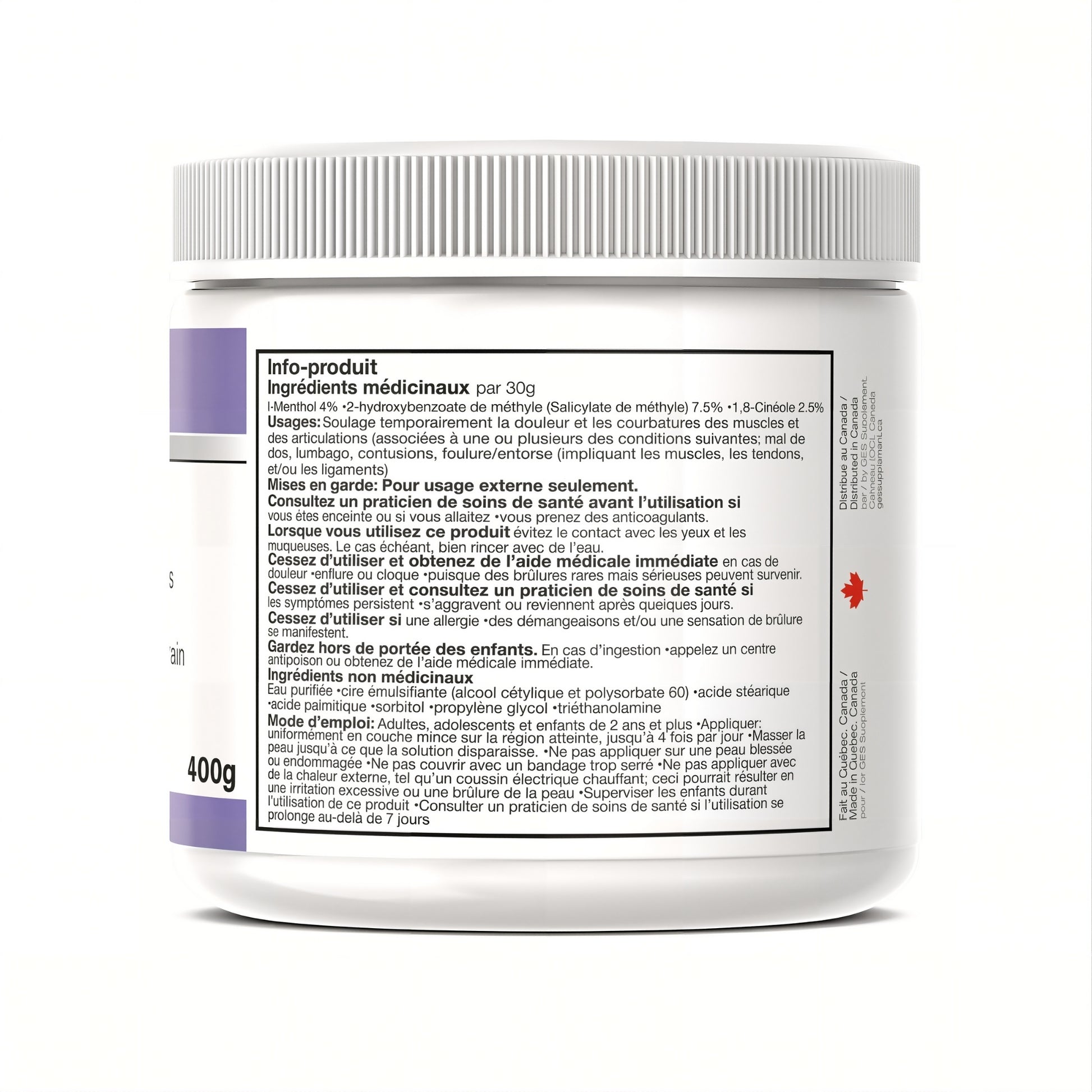Mises en garde : Pour usage externe seulement. Éviter le contact avec les yeux et les muqueuses. Ne pas appliquer sur une peau blessée ou irritée. Ne pas utiliser avec un coussin chauffant électrique. Si des rougeurs ou une irritation apparaissent, cesser l'utilisation. Garder hors de la portée des enfants.