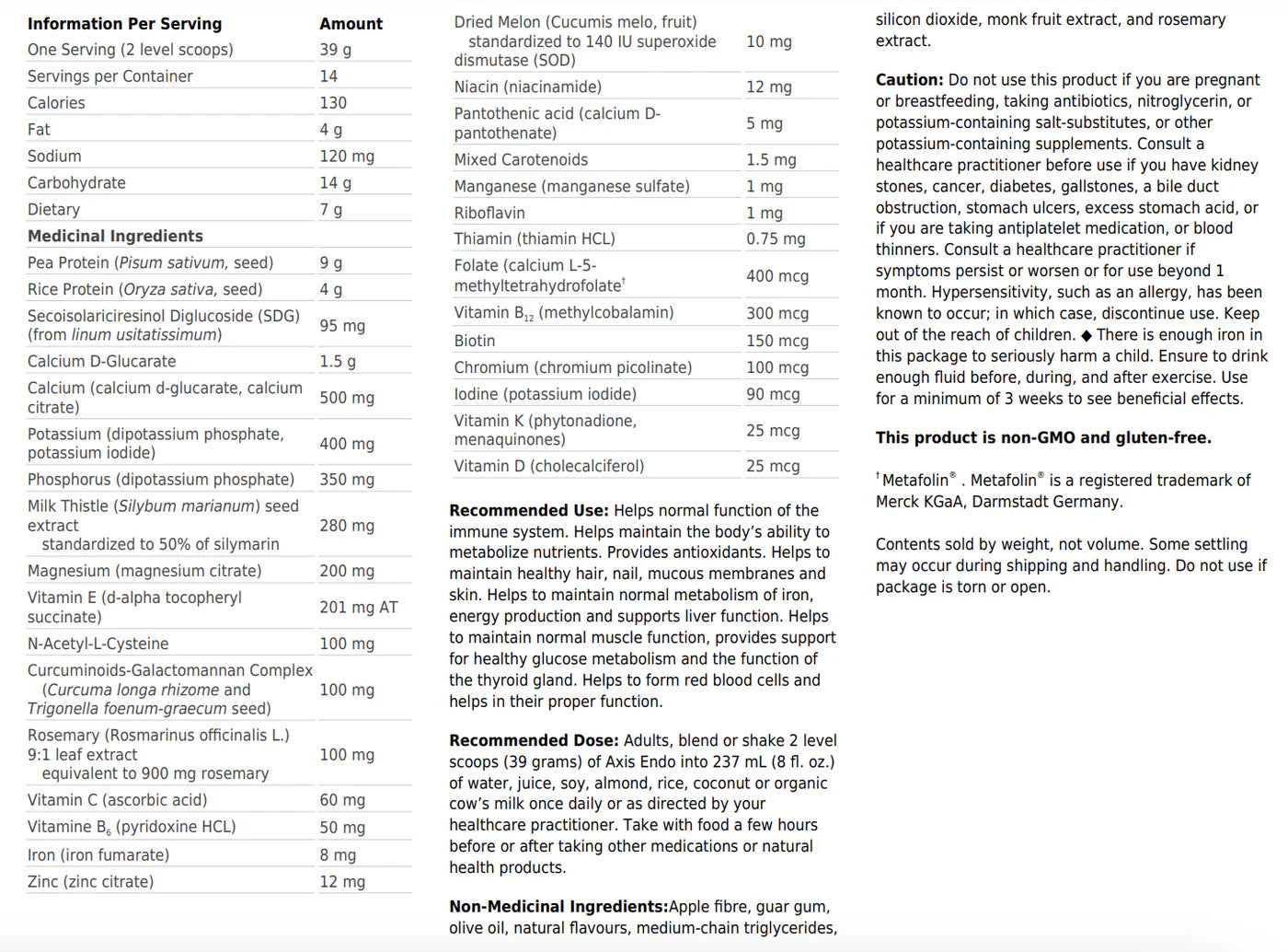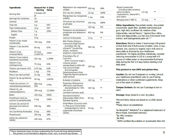 Adultes mélanger, ou secouer 2 mesure rases (40 grammes) d’Axis Endo dans 237 mL (8 fl. oz.) d’ eau, de jus, de lait de soja, de lait de riz, de lait de’amande, de lait de vache biologique, par jour ou selon les indications de votre professionnel de la santé. Prendre avec de la nourriture quelques heures avant ou après la prise d’autres médicaments ou produits de santé naturels.