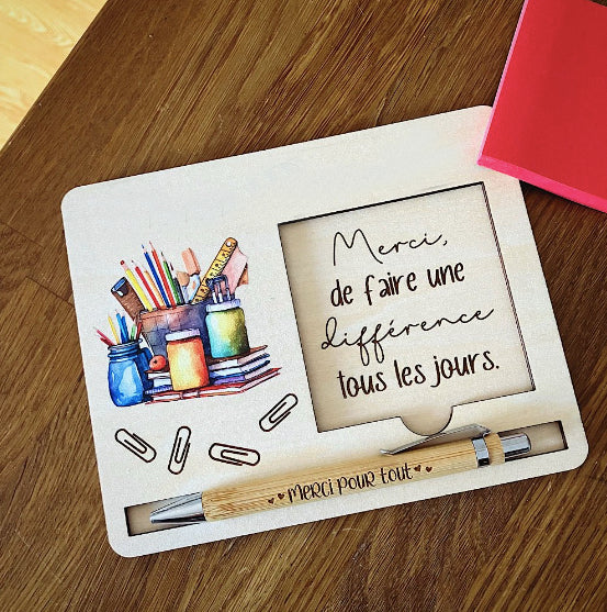 Ce porte bloc-notes en bois avec mention: "Merci de faire une différence tous les jours" gravée à l'intérieur sous le bloc-notes. Avec une magnifique illustration d'articles de bricolage imprimée dessus. Cela fera le cadeau parfait pour l'éducatrice (éducateur) de votre enfant. C'est un cadeau utile et pratique qui lui fera plaisir. Il peut également convenir pour une prof de maternelle. Un bloc-notes (post-it) couleur indéterminée est fourni avec ainsi qu'un stylo "Merci pour tout". Le bloc-notes mesure 5,5 X 7 pouces.