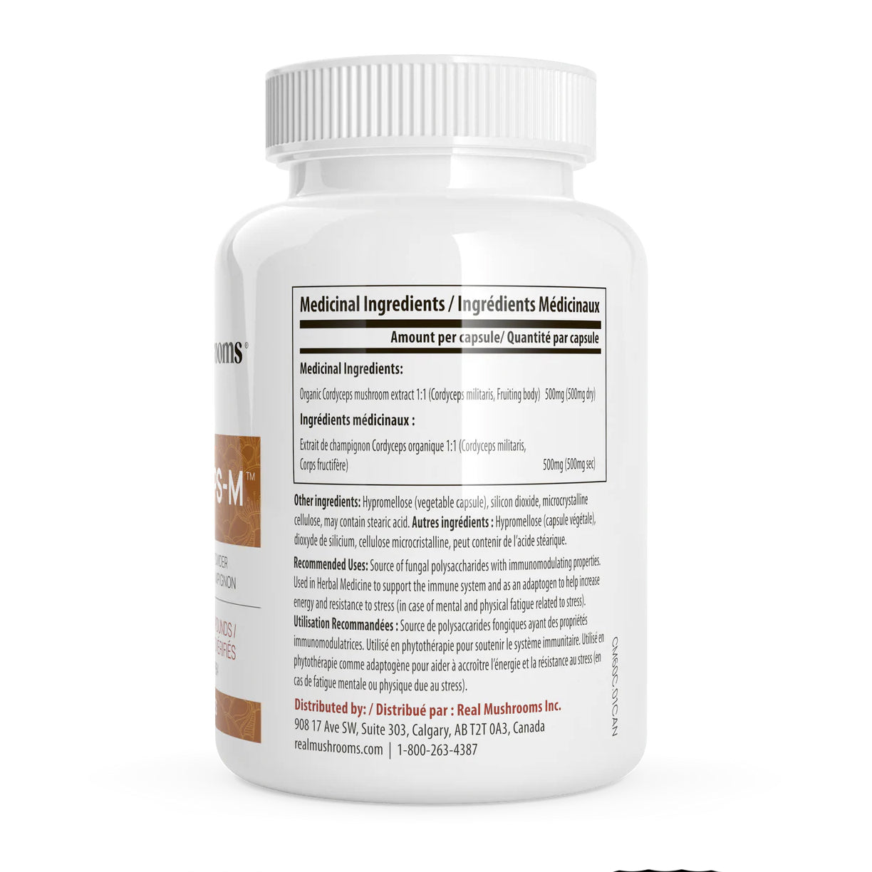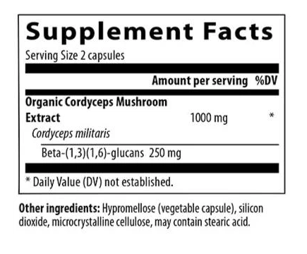Ingrédients médicinaux (par 2 capsules): Extrait de champignon Cordyceps biologique (Cordyceps militaris) ...... 1000mg Beta(1,3)(1,6)-glucans .... 250 mg Ingrédients non médicinaux : Hypromellose (capsule végétale), dioxyde de silicium, cellulose microcristalline, peut contenir de l'acide stéarique.