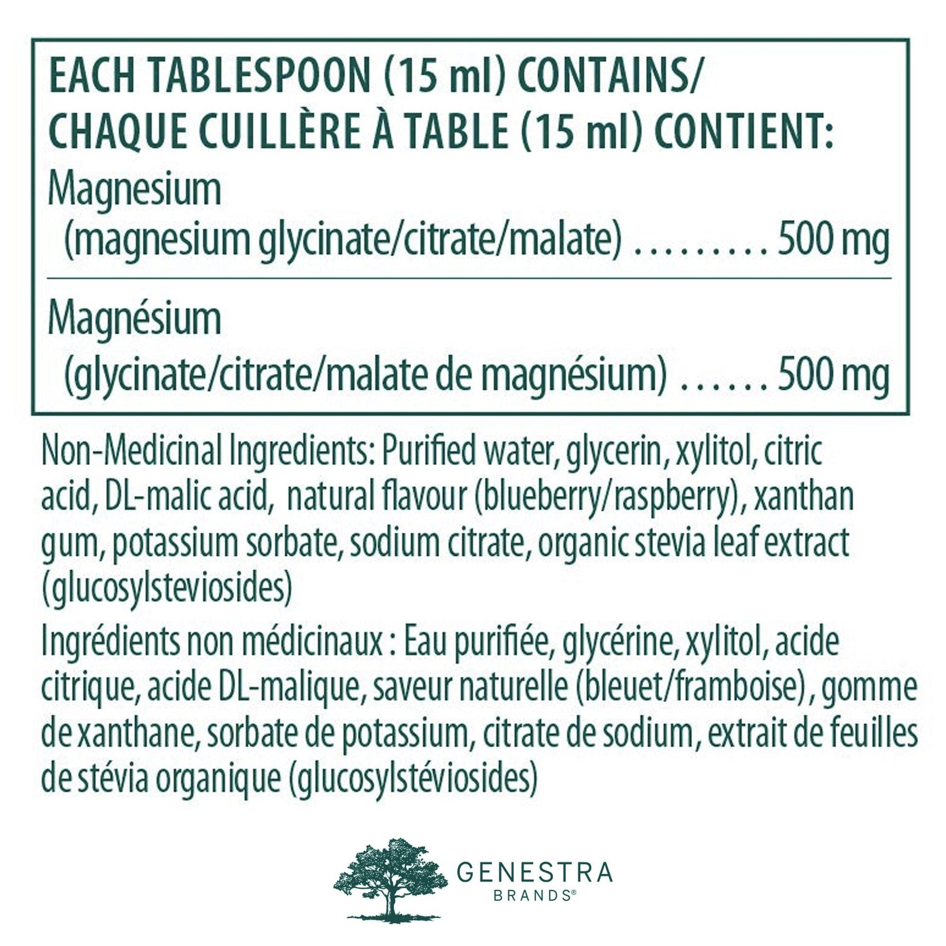 CHAQUE CUILLÈRE À TABLE (15 ml) CONTIENT: Magnésium (glycinate/citrate/malate de magnésium) .......500 mg. Ingrédients non médicinaux: Eau purifiée, glycérine, xylitol, acide citrique, acide DL-malique, arôme naturel (bleuet/framboise), gomme de xanthane, sorbate de potassium, citrate de sodium, extrait de feuille de stévia biologique.