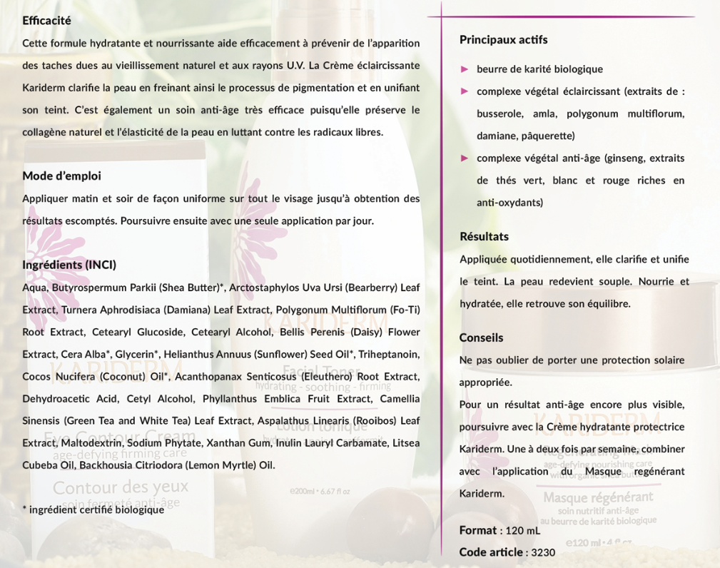 La Crème éclaircissante KARIDERM au beurre de karité est conçue comme un soin anti-âge qui combat de façon naturelle et non agressive les taches dues à l’action du soleil et au vieillissement de la peau. Grâce aux extraits de busserole, d’amla et de damiane, la crème éclaircissante KARIDERM freine et corrige le processus de pigmentation, donnant à la peau un teint lisse, plus uniforme et satiné. C’est donc un soin à la fois préventif et correcteur qui a de surcroît un léger effet tenseur sur la peau tout en l’hydratant. À utiliser assidument pour de meilleurs résultats.