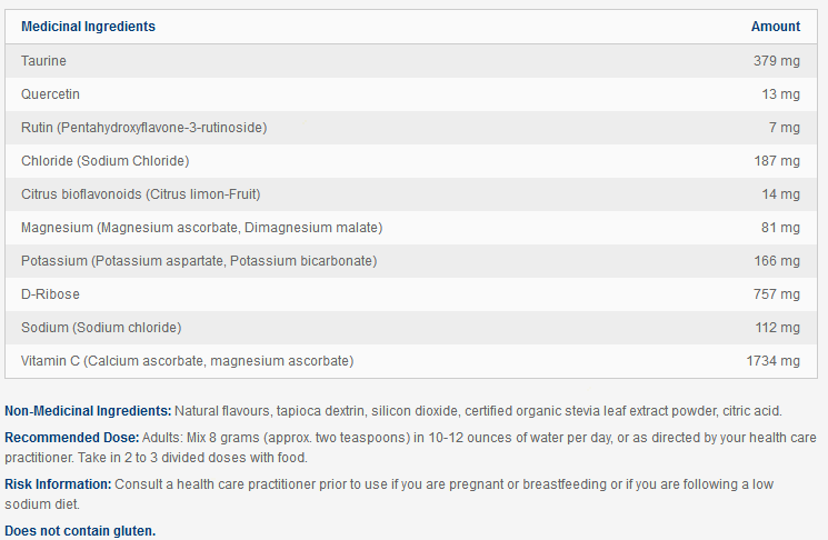Ingrédients non médicinaux : Arômes naturels, dextrine de tapioca, dioxyde de silicium, extrait de feuilles de stévia certifié biologique en poudre, acide citrique.