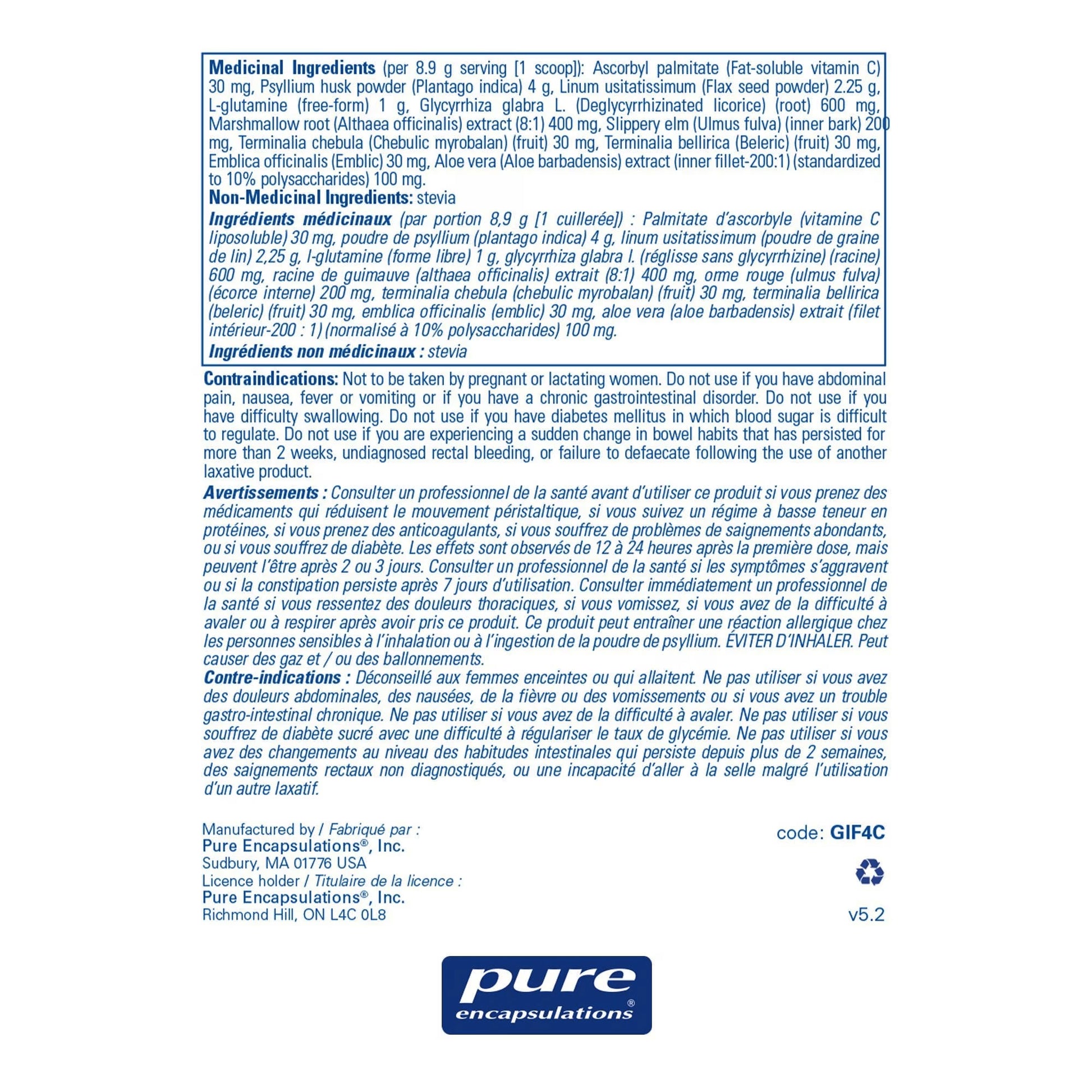 Ingrédients médicinaux par 1 mesure [8,9 g] : Vitamine C (palmitate d'ascorbyle) 12,6 mg, enveloppe de psyllium (Plantago ovata) 4 g, graine de lin (Linum usitatissimum) 2,25 g, L-glutamine 1 g, extrait de racine de réglisse déglycyrrhizée (Glycyrrhiza glabra) 600 mg (8:1, 4800 mg d'équivalent sec), extrait de racine de guimauve (Althaea officinalis) 400 mg (4:1, 1600 mg d'équivalent sec), écorce interne d'orme rouge (Ulmus fulva) 200 mg, fruit mûr de myrobolan chebulic (Terminalia chebula) 30 mg, fruit mûr de myrobolan bellérique (Terminalia bellirica) 30 mg, fruit d'Emblica officinalis (Emblica officinalis) 30 mg, gel de feuille d'aloès Extrait 100 mg (standardisé pour contenir 10 % de polysaccharides) (180:1, 18 g d'équivalent sec). Ingrédients non médicinaux : Feuille de Stevia rebaudiana