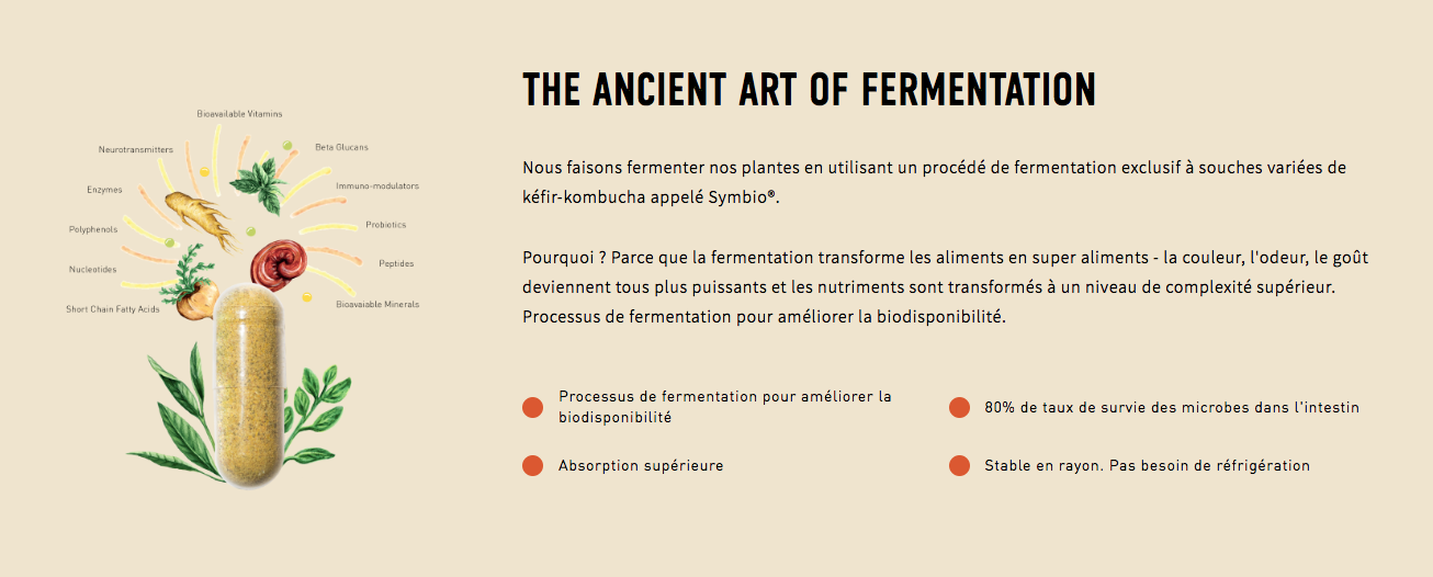« Les aliments fermentés sont employés depuis des temps immémoriaux dans les cérémonies et pour soutenir la virilité et la vitalité. Cette formule combine des traditions antiques afin de fournir une gamme de nutriments hautement actifs de plantes et racines employées lors de rituels pour optimiser la vitalité et la performance. »
