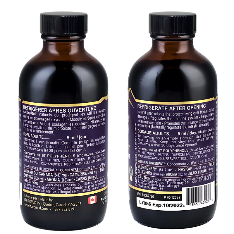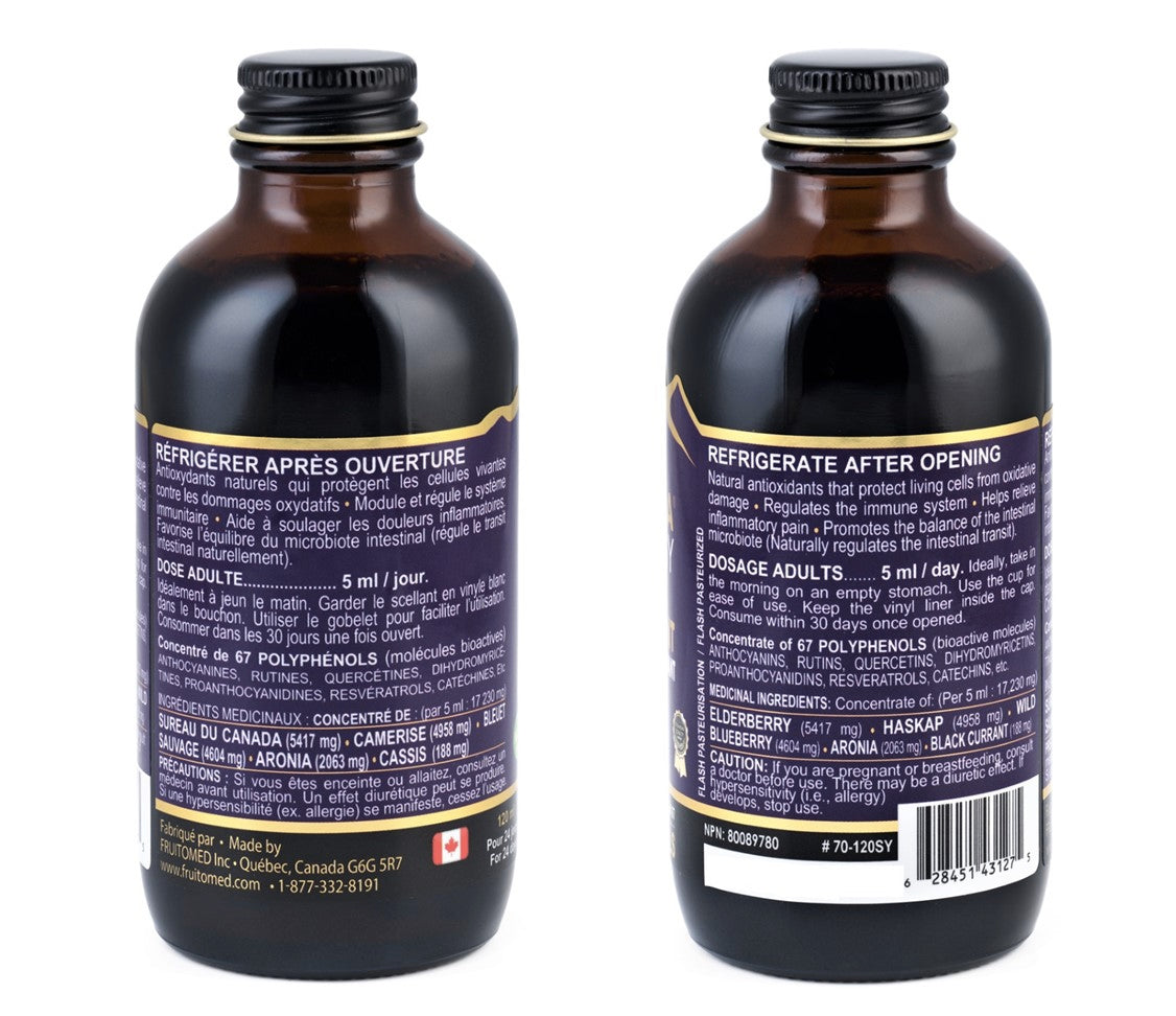 Concentré de polyphénols extraits des cinq fruits les plus antioxydants du Québec : sureau, camerise , bleuet sauvage, aronia, cassis