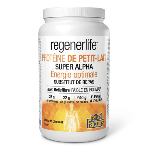 Des recherches récentes ont démontré que le maintien d’un poids santé peut avoir un effet positif sur votre santé à long terme ! Protéine de petit-lait Super alpha de la gamme Regenerlife contribue à satisfaire votre appétit et favorise une gestion saine du poids dans le cadre d’un régime à faible teneur en énergie ! En plus de 25 g de protéines de petit-lait de haute qualité, nous avons ajouté ReliefibreMD faible en FODMAP, afin que vous puissiez mieux gérer vos fringales et vous sentir rassasié plus longtemps. Cette formule inclut également des vitamines essentielles, des minéraux, de la lécithine, et des triglycérides à chaîne moyenne (TCM), et peut être utilisée comme substitut de repas.