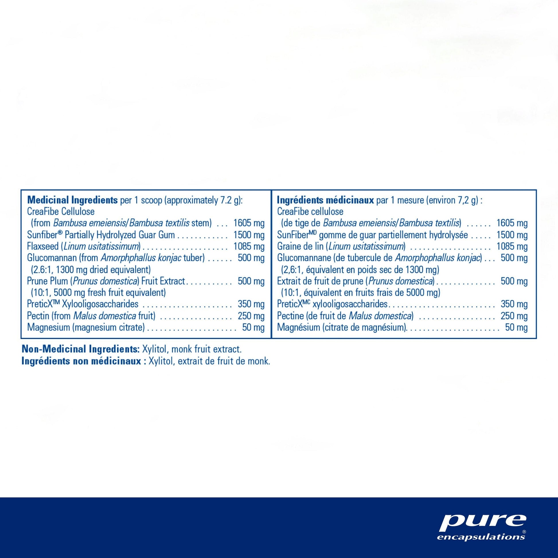 Ingrédients: Ingrédients médicinaux par 1 mesure (7,2 g): Magnésium (citrate de magnésium) 50 mg, xylooligosaccharides PreticXTM 350 mg, cellulose CreaFibe (de la tige de Bambusa emeiensis/Bambusa textilis) 1605 mg, gomme de guar hydrolysée Sunfiber® 1500 mg, graines de lin (Linum usitatissimum) 1085 mg, glucomannane (du tubercule d'Amorphphallus konjac) 500 mg (2,6:1, 1300 mg en équivalent séché), prune (Prunus domestica) 500 mg, pectine (du fruit de Malus domestica) 250 mg. Ingrédients non médicinaux: Xylitol, extrait de fruit des moines.