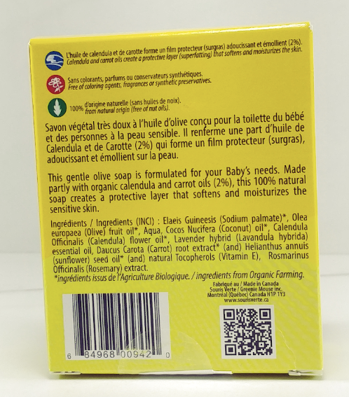 Voici une barre de savon au calendula bio assez douce pour être utilisée du poupon… à l'arrière-grand-parent 100% naturel, il contient une part d'huile de calendula biologique et de carotte qui forment un film protecteur (surgras), adoucissant et émollient sur la peau.