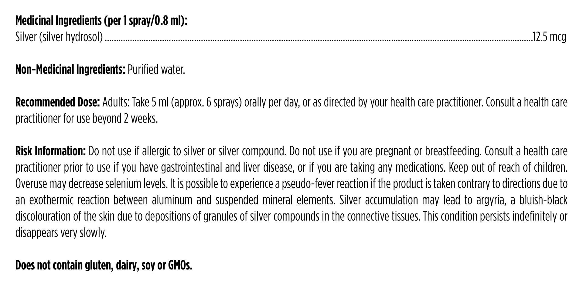 SilverPure™ est composé de 15 ppm d'argent pur complexé à de l'eau purifiée. SilverPure™ utilise la technologie Silver Sol®, le terme « sol » désignant un minéral présent en permanence dans la structure de l'eau. L'argent s'intègre ainsi durablement à la molécule d'eau, évitant ainsi toute dispersion en solution ou en suspension. SilverPure™ est une forme d'argent hautement puissante et non toxique, sans accumulation dans l'organisme.