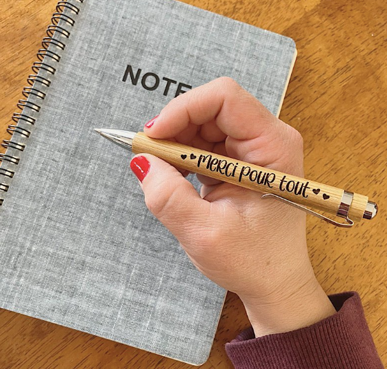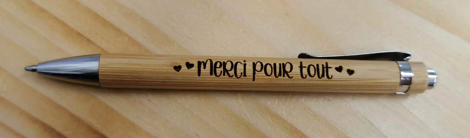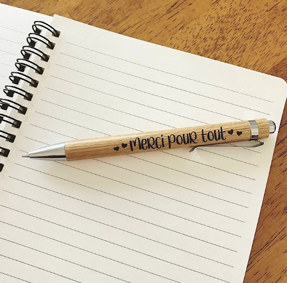 Un stylo pour remercier quelqu'un, avec la mention gravée sur le bois : « Merci pour tout » ça fait un beau cadeau où la personne pensera à vous à chaque fois qu'elle l'utilisera. Stylo en bois à encre bleue.
