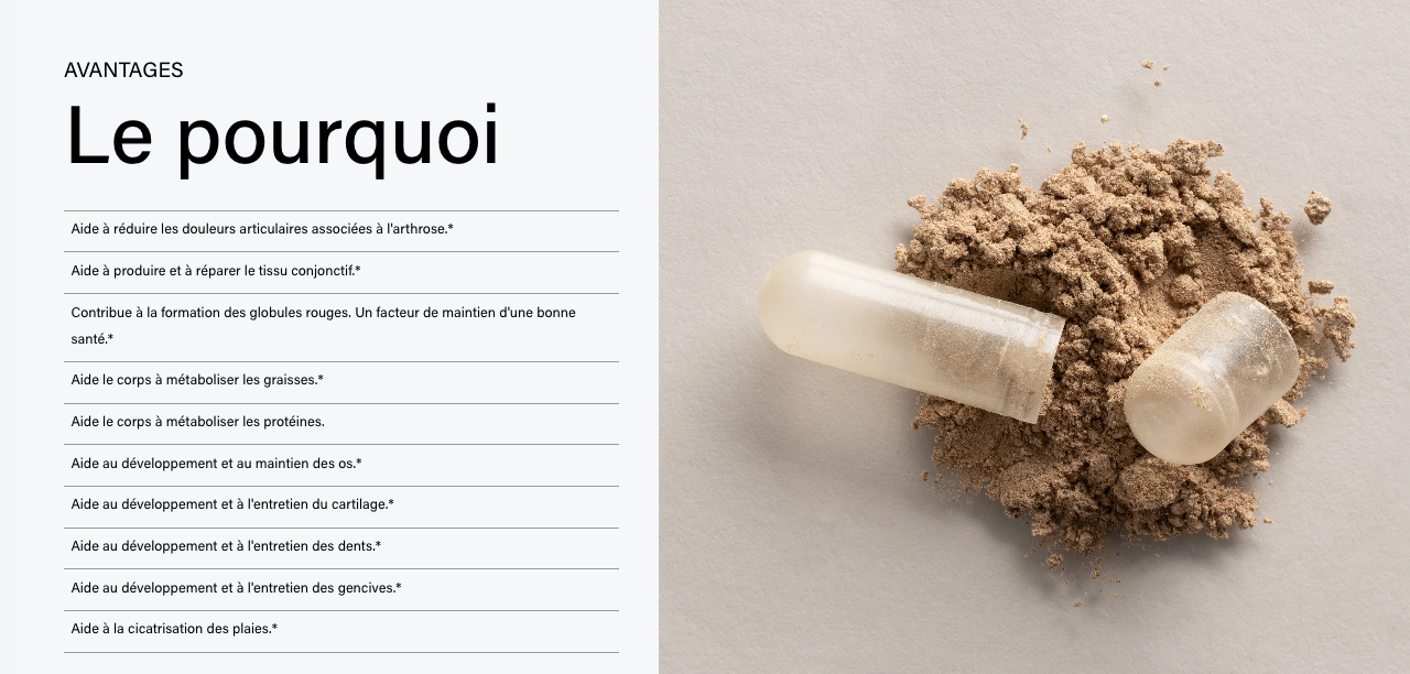 Usage ou finalité recommandés : Une formule unique et puissante pour la régénération du collagène de type 1 et 2 de la peau, des tendons, des cartilages, des ligaments, des os, des muscles et de tout tissu conjonctif. Anti-inflammatoire, elle ralentit également le processus de vieillissement des tissus conjonctifs.