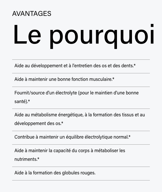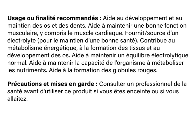 Usage ou finalité recommandés : Aide au développement et au maintien des os et des dents. Aide à maintenir une bonne fonction musculaire, y compris le muscle cardiaque. Fournit/source d'un électrolyte (pour le maintien d'une bonne santé). Contribue au métabolisme énergétique, à la formation des tissus et au développement des os. Aide à maintenir un équilibre électrolytique normal. Aide à maintenir la capacité de l'organisme à métaboliser les nutriments. Aide à la formation des globules rouges.