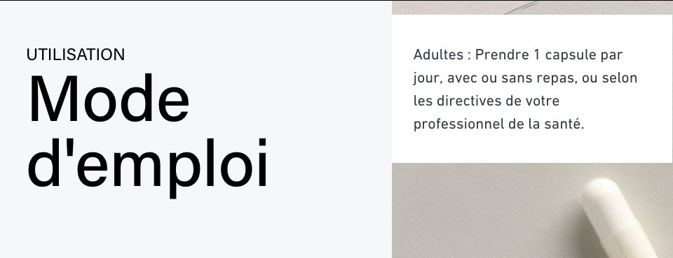 Adultes : Prendre 1 capsule par jour, avec ou sans repas, ou selon les directives de votre professionnel de la santé.