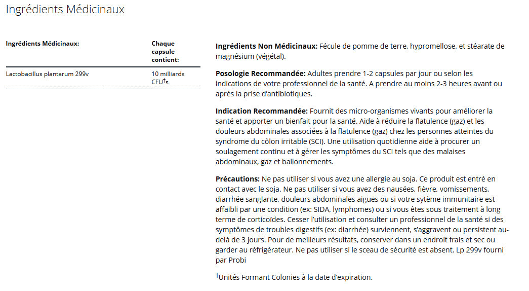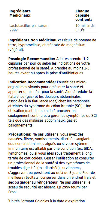 Précautions: Ne pas utiliser si vous avez des nausées, fièvre, vomissements, diarrhée sanglante, douleurs abdominales aiguës ou si votre sytème immunitaire est affaibli par une condition (ex: SIDA, lymphomes) ou si vous êtes sous traitement à long terme de corticoïdes. Cesser l’utilisation et consulter un professionnel de la santé si des symptômes de troubles digestifs (ex: diarrhée) surviennent, s’aggravent ou persistent au-delà de 3 jours. Pour de meilleurs résultats, conserver dans un endroit frais et sec ou garder au réfrigérateur. Ne pas utiliser si le sceau de sécurité est absent. Lp 299v fourni par Probi.
