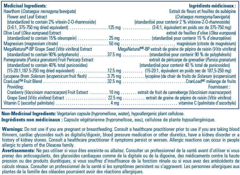 750 mg d'équivalent sec) .................. .125 mg Feuille d'olivier (Olea europaea) (normalisée pour contenir 15 % d'oleuropéine) .............. . 25 mg Magnésium (citrate de magnésium) ....................... . 50 mg Extrait de pépins de raisin (Vitis vinifera) MegaNatural MD (normalisé pour contenir 90 % de polyphénols) ............. .37,5 mg Extrait de péricarpe de fruit de grenade (Punica granatum) (normalisé pour contenir 40 % de punicosides totaux) (15-20:1,187,5-250 mg d'équivalent sec) ............... .12,5 mg Lycopène (provenant de la chair du fruit de Solanum lycopersicum) ......... .3,75 mg Mélange de fruits CranLoad™ ............................... .32,5 mg Fournissant : Extrait de fruit de canneberge (Vaccinium macrocarpon) ........ . 10 mg Extrait de pépins de raisin (Vitis vinifera) .................... . 22,5 mg Vitamine C (palmitate d'ascorbyle) ........................... . 4 mg Ingrédients non médicinaux : Capsule végétarienne (hypromellose, eau), cellulose végétale hypoallergénique