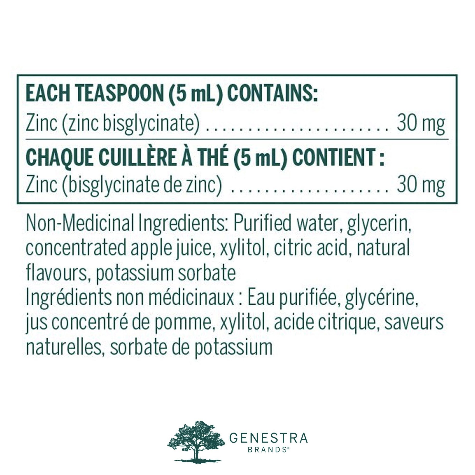 CHAQUE CUILLÈRE À THÉ (5 ml) CONTIENT: Zinc (bisglycinate de zinc) ......................30 mg. Ingrédients non médicinaux: Eau purifiée, glycérine, jus de pomme concentré, xylitol, acide citrique, arômes naturels, sorbate de potassium